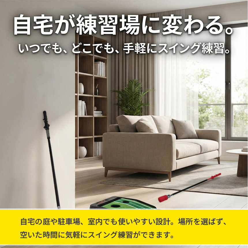 広いスペースを必要とせず、自宅・庭・駐車場などさまざまな場所で練習可能。練習場に行けない日でも、スイング確認ができます。