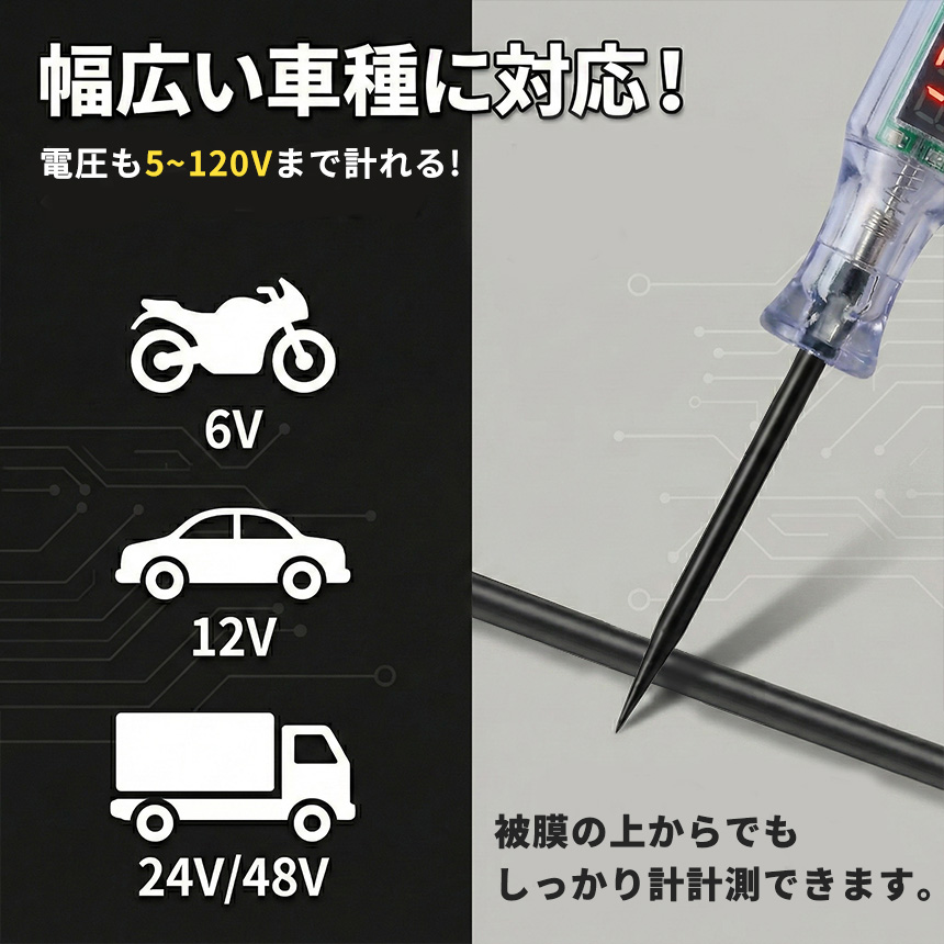 2個セット 検電テスター デジタル 電圧計 車 バイク 5V-120V 故障診断 通電確認 LED判定 バッテリー チェッカー 配線 整備 工具 DIY メンテナンス 電装品 取り付け アースクリップ コイルケーブル サーキットテスター