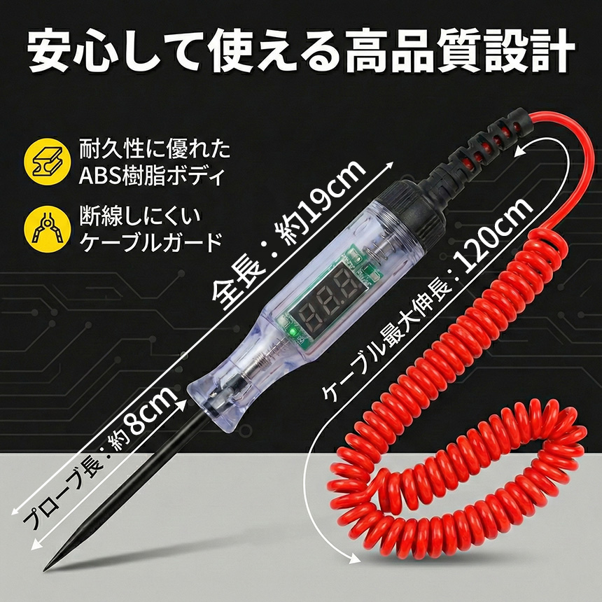 伸縮コイル式を採用。最大約120cmまで伸びるため、離れた場所の通電チェックもスムーズです。