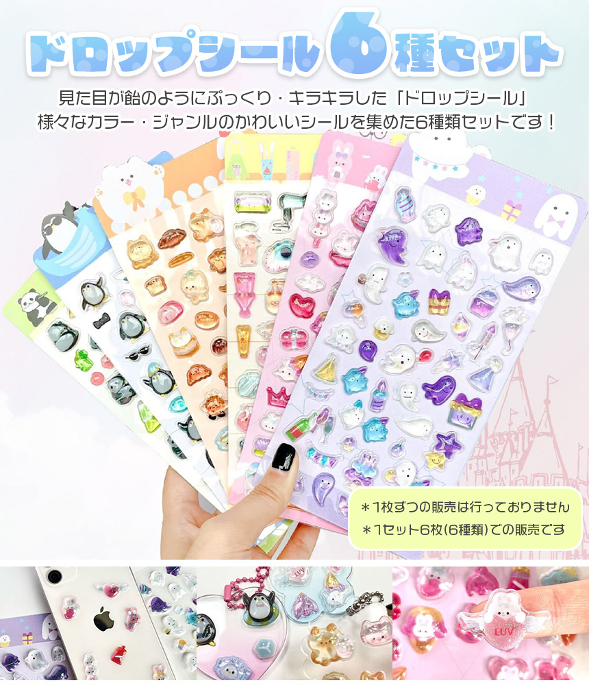 ドロップシール 6種類セット ボンボンシール おはじきシール 3D 立体 シール ぷっくり キラキラ クリア 透明 かわいい 可愛い シール帳 ノート デコ デコレーション シール交換 うさぎ 動物 パンダ ペンギン パン スイーツ おばけ ハート ピンク 食べ物 小物 魚 猫