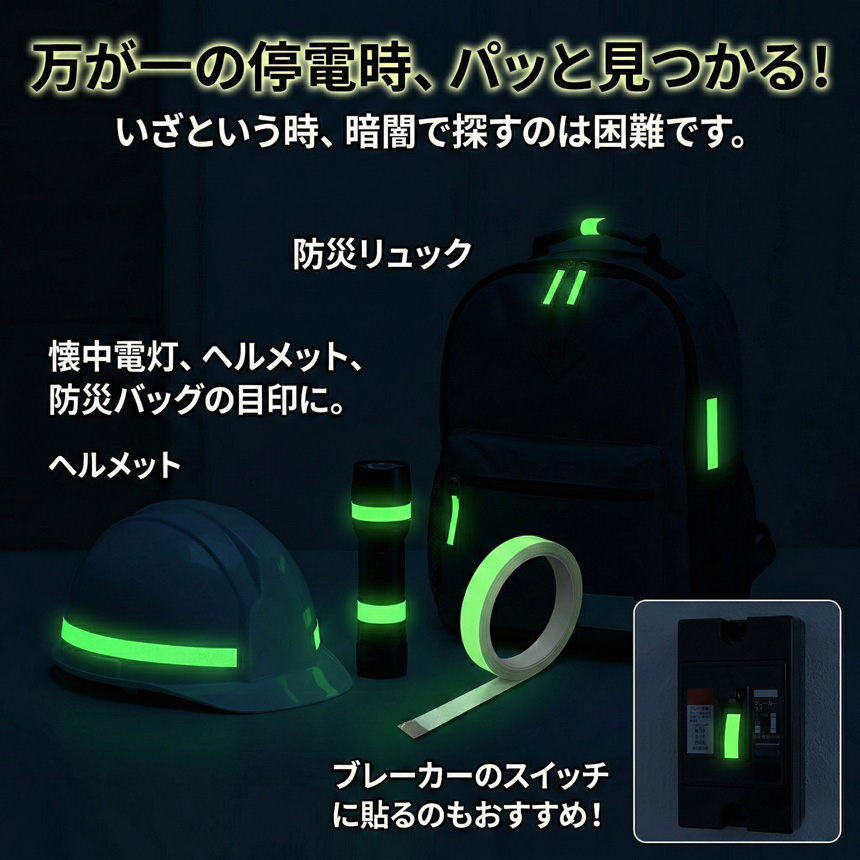 ・防災グッズ:懐中電灯やヘルメットに貼って、暗闇での紛失防止に。
