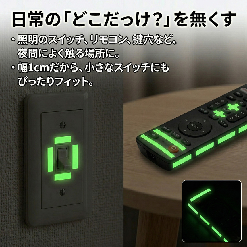 スリムな幅なので、階段の縁、ドアノブ、リモコン、さらには避難用リュックのジッパーなど、細かい場所にもスッキリ貼れます。