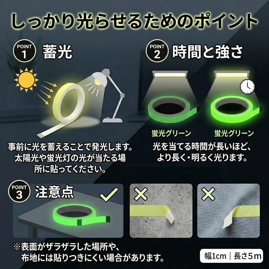 3個セット 蓄光テープ 1cm幅 穏やかな発光 目印 夜光テープ 防災 階段 段差 廊下 転倒防止 停電 避難 強力粘着 DIY シール 蛍光テープよりも優しい光 インテリア 介護 子ども ペット 安心 安全 夜間の目印に最適 眩しすぎないソフトな輝き