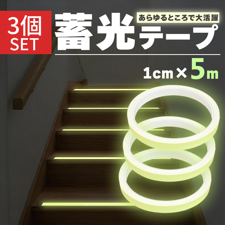 3個セット 蓄光テープ 1cm幅 穏やかな発光 目印 夜光テープ 防災 階段 段差 廊下 転倒防止 停電 避難 強力粘着 DIY シール 蛍光テープよ