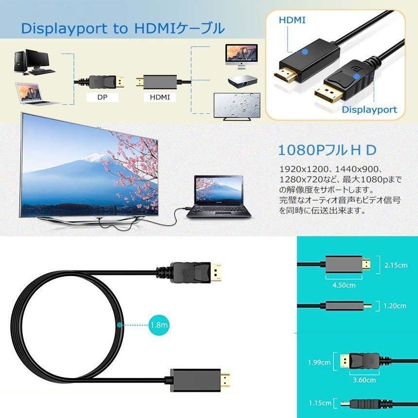 金メッキ DisplayPort to HDMIケーブル ディスプレイポートto HDMI アダプター 逆に転換不能