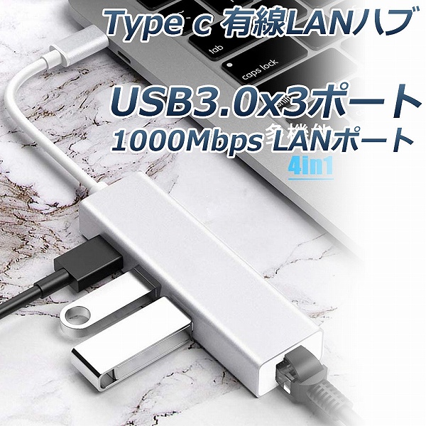 【USBC有線LANアダプタ+USB3.0ハブ】USBTypeCコネクタで1000Mbps有線LANアダプターと最もよく使われるUSBポートをこの一本に揃えて、実用性が高い。