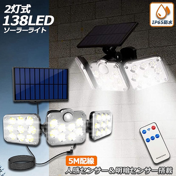 【138LED・3面発光・300°照明】 屋外ソーラーライトには800ルーメンを備えた138個のLEDチップが搭載しております。夜間の活動の安全性を確保するために、夜間により強い光を提供できます。3面発光のデザインで照明角度が300°に達すだけでなく、両側のライトは上下左右150°回転することができますから、照明が必要な場所で照明角度を自由に変えられます。ラーパネルの部分は上下左右150°の角度に調節できますので、太陽の良く当たる方へ向けられ、十分にソーラー充電できます。センサー検知角度が120°になりましたので、夜の防犯灯としてもすごく実用です。