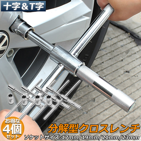 十字レンチ 4個セット クロスレンチ 分解式 T字 十字 空転式 回転可能 フリーグリップ 早回し 17mm 19mm 21mm 23mm 車