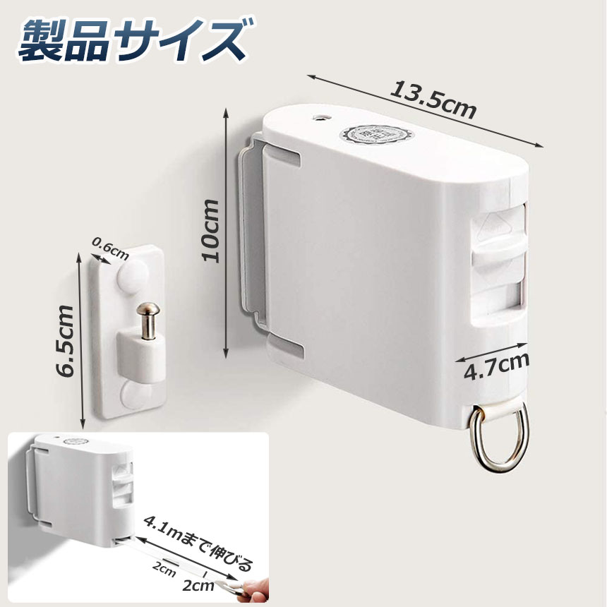 等間隔で穴が空いているので、よく乾く伸縮自在なので使いたいときにいつでも乾せる従来の 折りたたみ式 室内物干し は大きくて邪魔だけどコンパクト梅雨、雨の日や花粉の時期はもちろん、寒さや雪が気になる冬にも大活躍!ワイヤー長4.1M高強度ワイヤーなので耐荷重20kg もありますリビング 部屋 ベランダ などに設置可能なので 便利