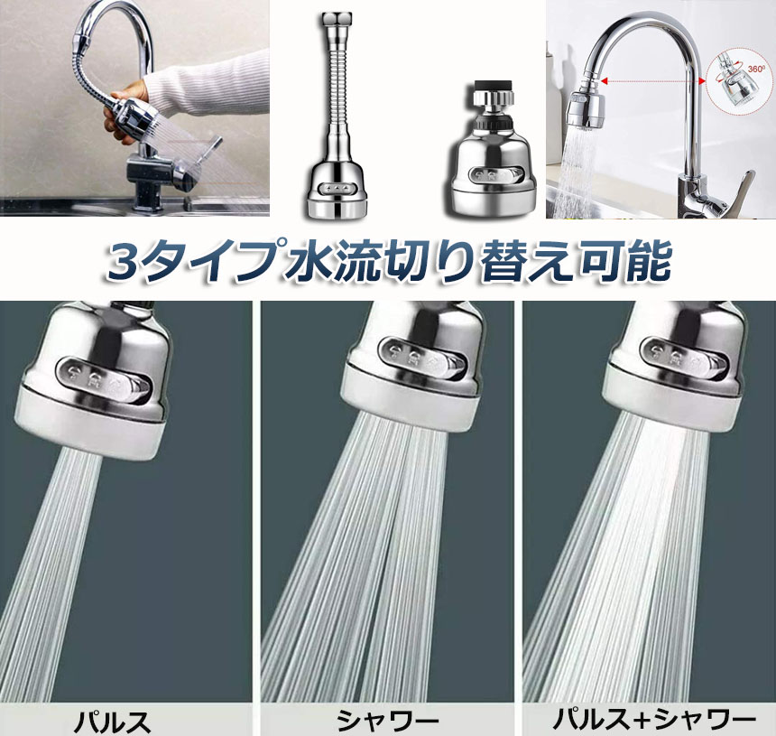 【3段階モード】左右に回転するだけで水の流れが変わります。パルスモード:試験管など手を中に入れない小径容器に最適です。シャワーモード:色々な汚れた物の洗うに適しています。パルス+シャワーモード:特に深い汚れをきれいにするために使用されます。用途に応じて各モードを簡単に変えることができます。