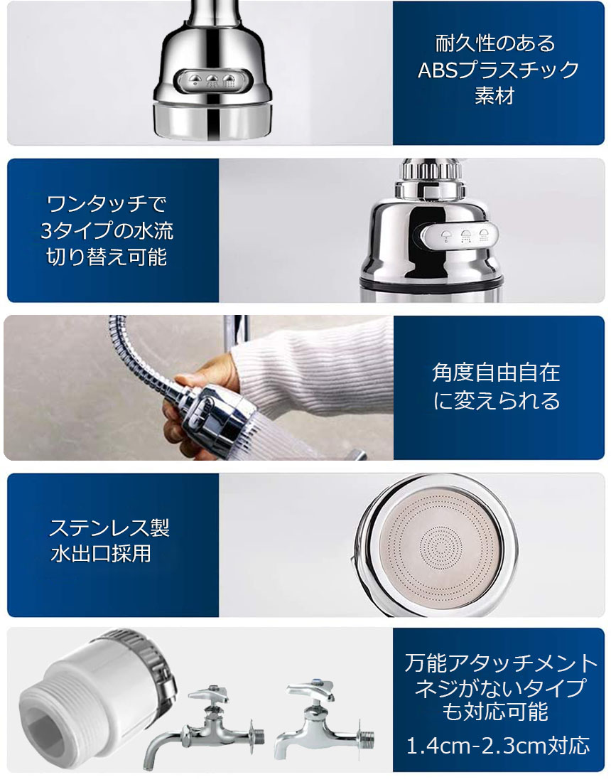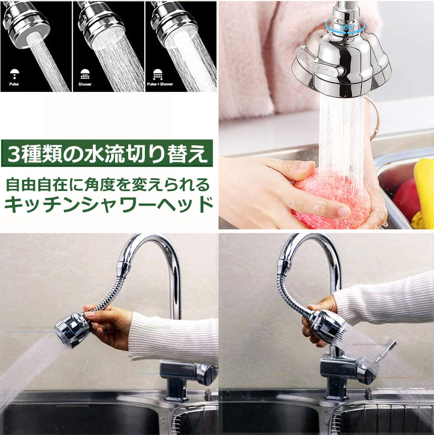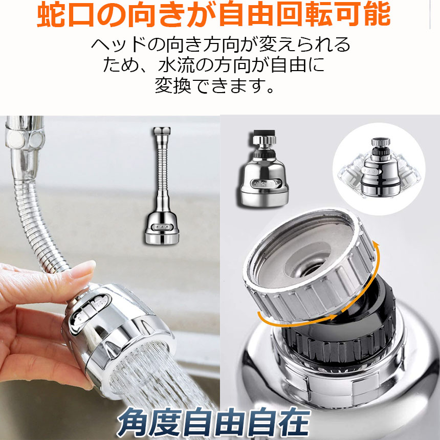 【 360度自由自在】 本製品の蛇口シャワーは、360度自由自在に方向を動かすことが可能です。稼働域が広がるため、シンクの掃除をしたり大きめのフライパンや鍋、お皿を洗ったりする際に便利です。効率よく食器洗いやお掃除をしていただけるため、時間短縮となり家事の負担を減らしてくれます。また、方向を動かしたときその位置を保つことができるため、両手を使用して作業を行えます。