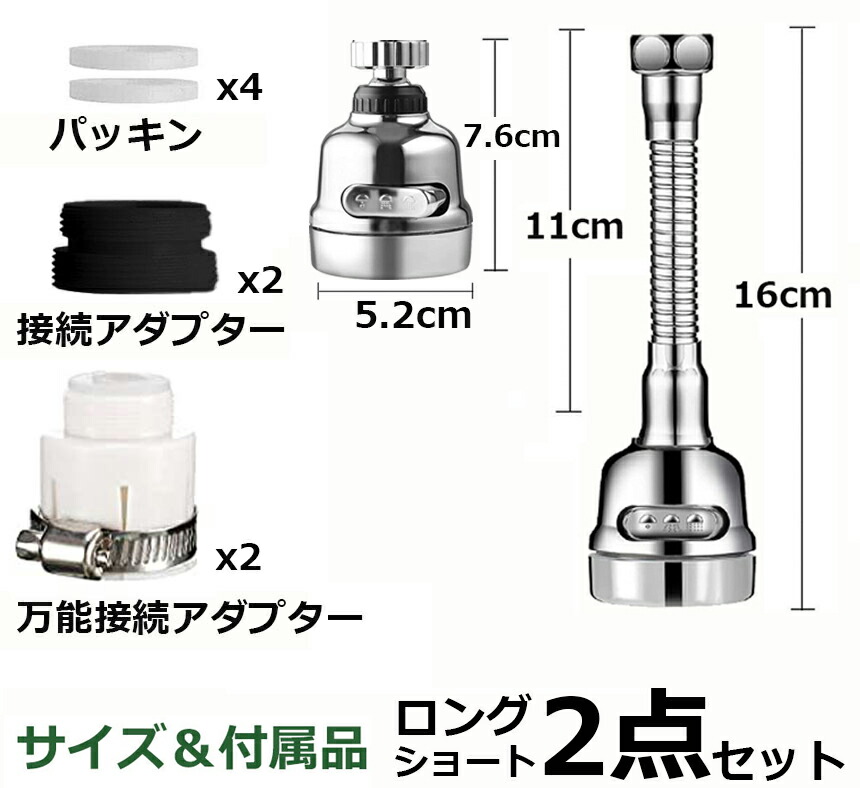 【ショートタイプロングタイプ2個セット】ショートタイプ:7.5cm、ロングタイプ:17cm。ショートタイプ:キッチンや洗面所など蛇口が一般的な高さの場所に最適です。・ロングタイプ:ステンレス製ホースで好きな角度に固定が可能!!高い位置にある蛇口に取り付け、水ハネを防ぎます。