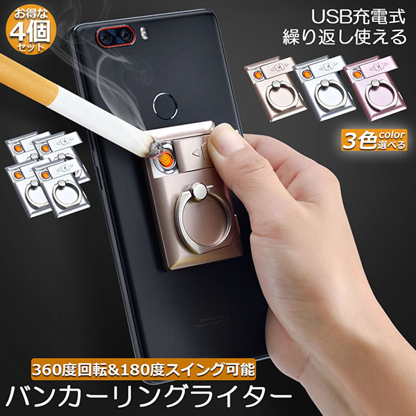 USBライター 電子ライター バンカーリング スマホ車載ホルダー 4個セット スマホホルダー プラズマ ライター 小型 充電式 ガスオイル不要 繰り返