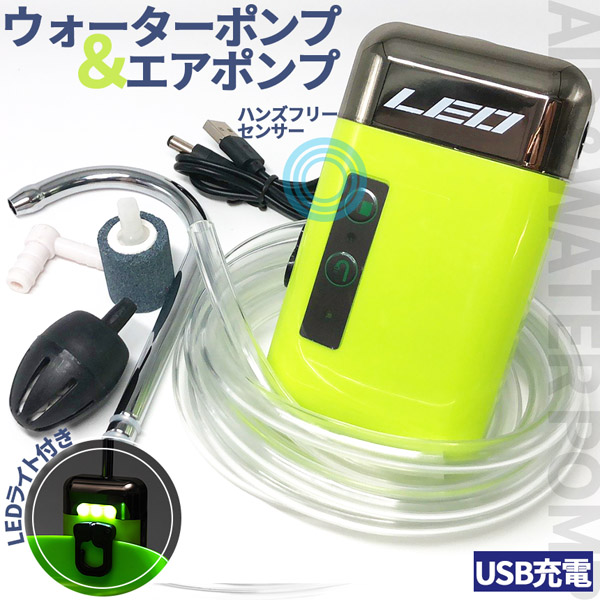 【エアーポンプ&ウォーターポンプの2役】エアーポンプとウォーターポンプ、そしてハンズフリーで利用できるセンサー付き!小型でも多機能なポンプで、充電式だから、コンセントを気にする必要もありません♪【センサー感知で使用できます】製品本体に触れずに使用可能です。電源ボタンを長押しすると、赤いランプが光り、センサーモードになります。もう一度長押しでOFFになります。【使用用途】釣りやキャンプといったアウトドアや、畑や農園などの水道がない場所での手洗いなど、用途様々!