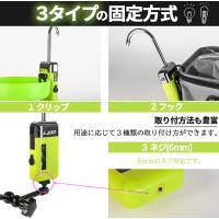 クリップ、フック、三脚等につけられる6mmのネジ式の3種類で固定できます。