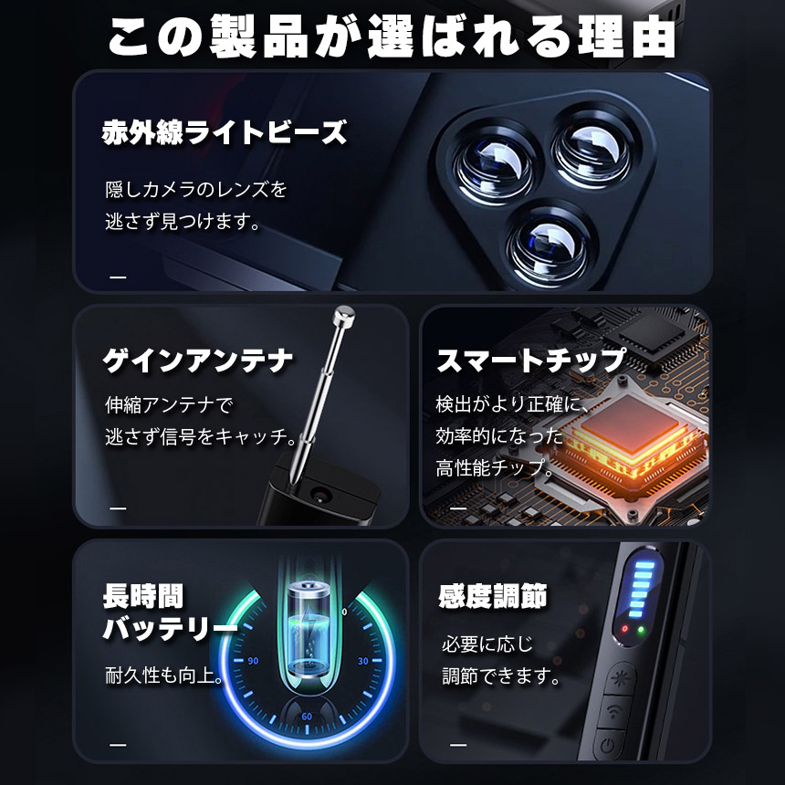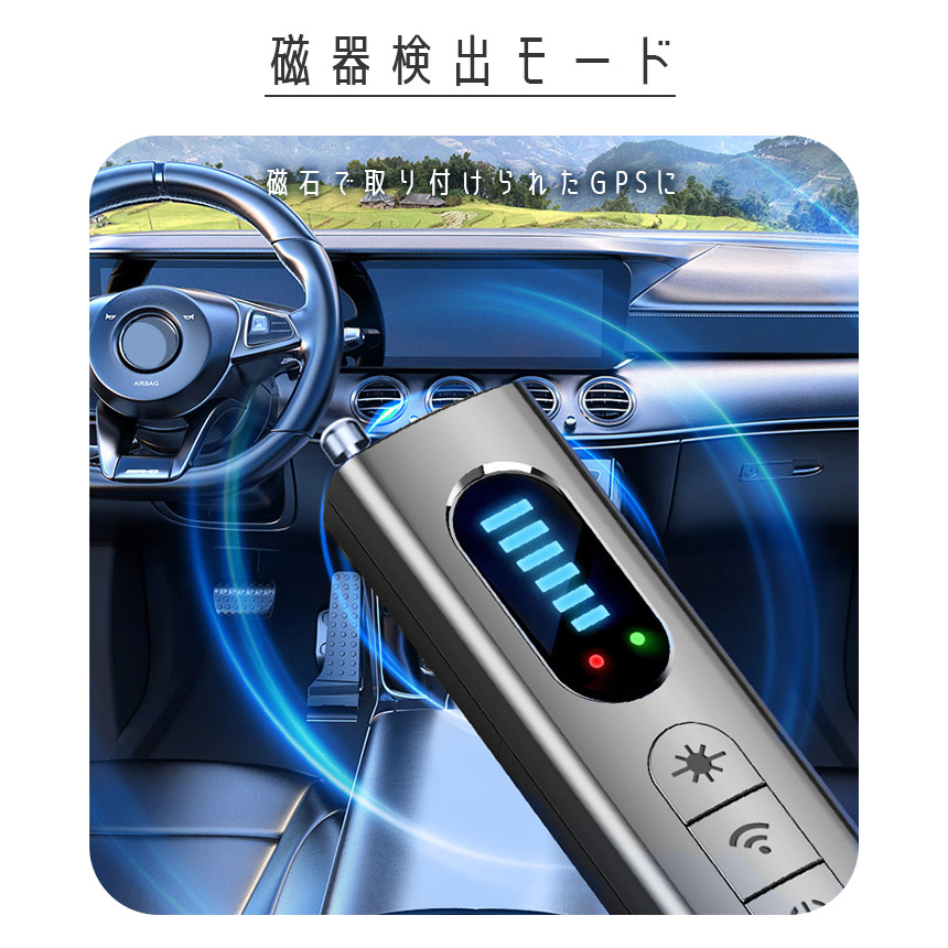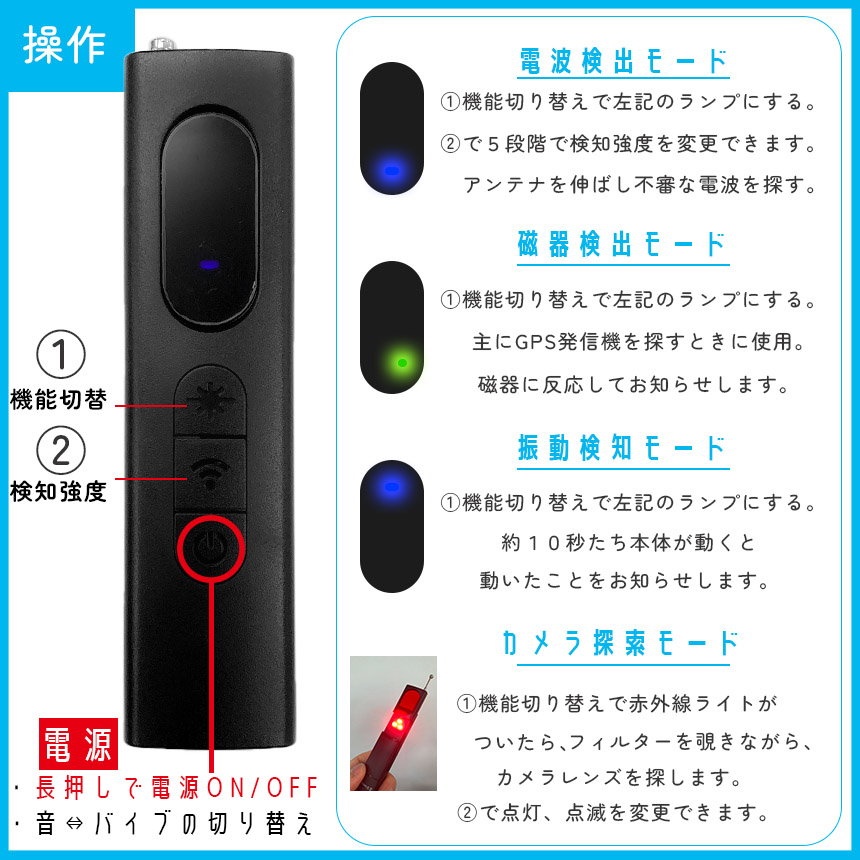 盗聴器、隠しカメラを発見する高性能機器電波キャッチ、赤外線でレンズ探索、GPS機の磁気を感知【不安を安心に、高性能発見器】・簡単操作、小さくて持ち運びやすい。・電波をしっかりキャッチ。・音or振動でお知らせ、強度も表示。・隠しカメラのレンズも探せる。・振動感知で防犯機能も・LEDライトにもなります