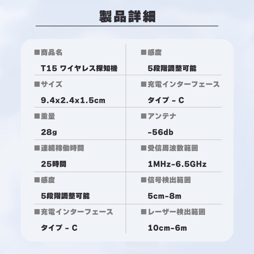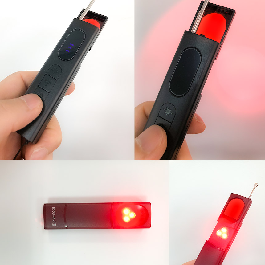 ・カメラレンズに反応する赤外線レーザーとフィルターで目視でカメラを探すことができます。電波を発していないカメラを探すときに活用できます。点灯、点滅パターンを選べ、より分かりやすく発見しやすくできます。