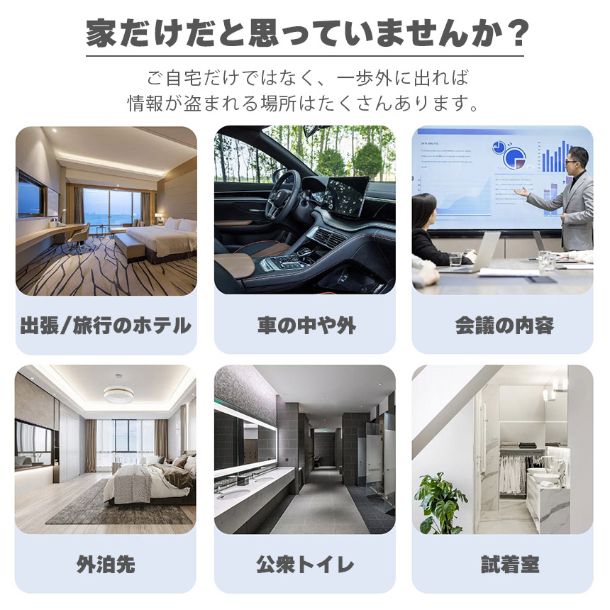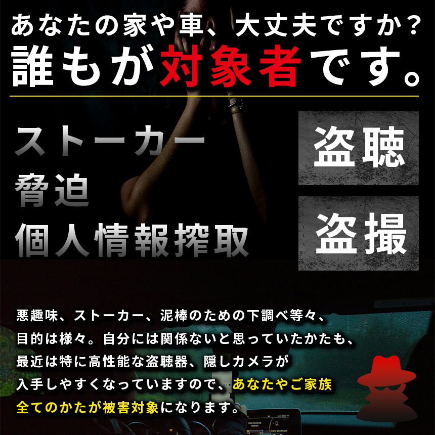 最近は、誰でも簡単に高性能な隠しカメラ、盗聴器、GPS機が入手できます。ストーカーなどの場合だけでなく、泥棒などが事前に情報を入手するため、個人情報を盗むため、GPSを車などに簡単に設置、等々数えきれないパターンがあり、あなたも被害者に十分なりえます。まさか自分が...といったケースが増えていますし、ぜひ、今一度ご自分と家族を守るための行動を心がけで頂きたいです。