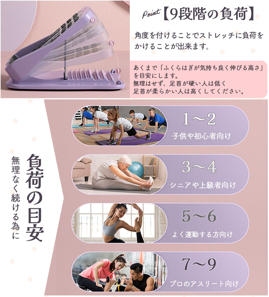 角度を9段階変えられて負荷が掛けられます。あくまで、「ふくらはぎが気持ちよく伸びる高さ」を目安にします。無理はせずご自身のできる範囲で調節してください。