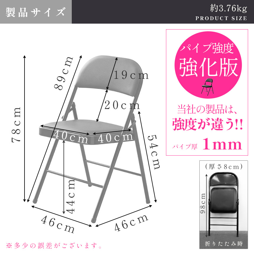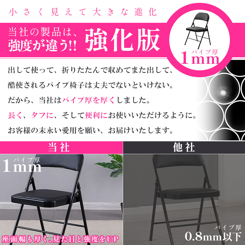 この製品は、パイプ厚強化でよりタフに長く使用することができます。雑に扱われ気味なパイプ椅子だからこそ大事なポイント。安心してご使用いただけます。