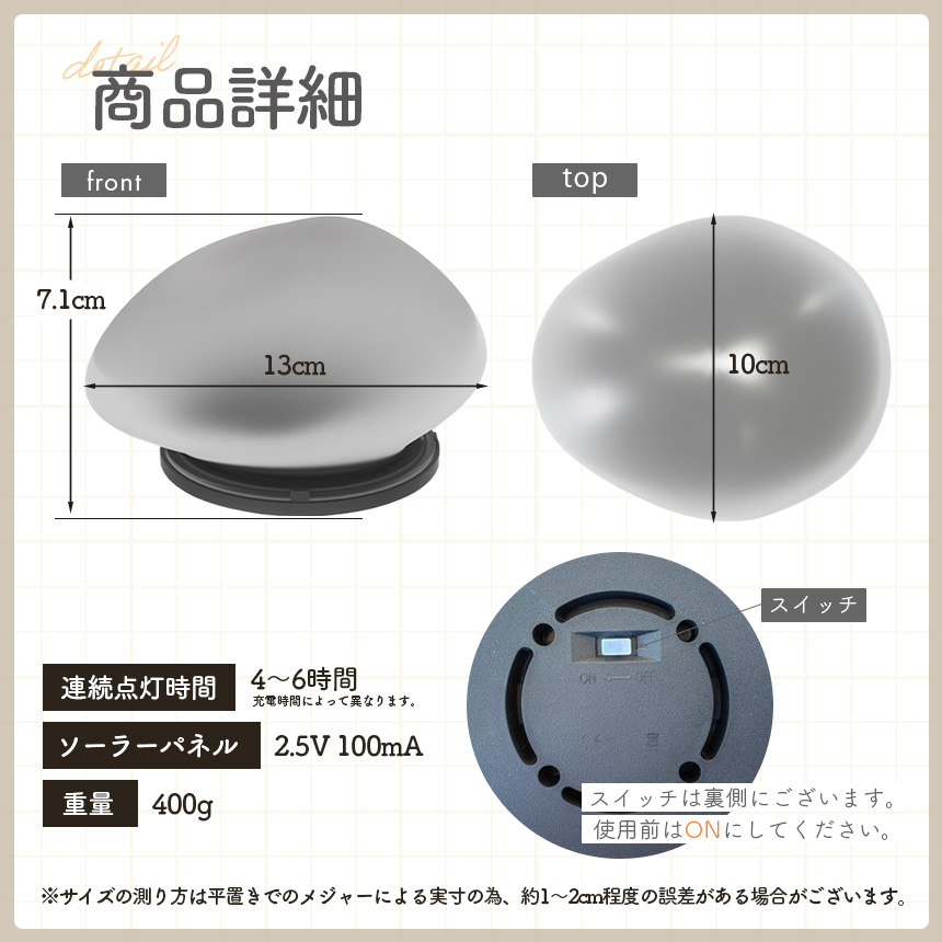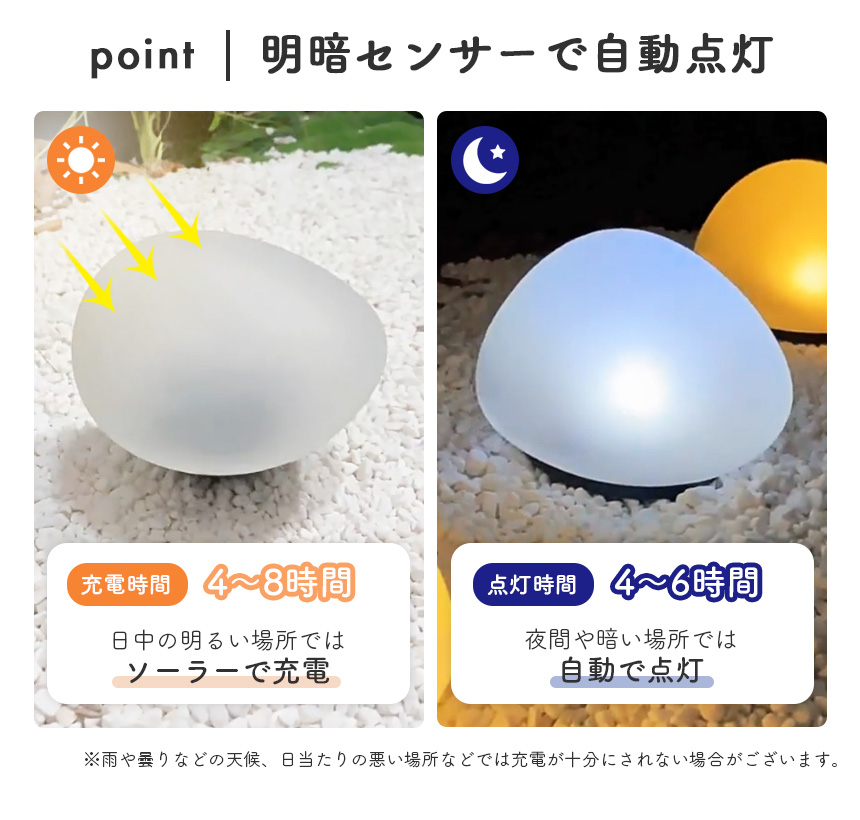 ●柔らかい光 石型ライト●すりガラスのような本体から柔らかい光に癒される石型ライトです。お庭やテラスに置くと幻想的な雰囲気になります。point1【ソーラー充電式】ソーラーパネル内蔵なので電池交換は不要です。電気代0円なのでとっても経済的!※設置する際は日当たりがいい場所に置いてください。