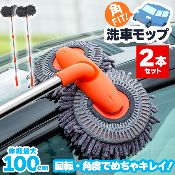 二つのモップがそれぞれ回転&角度が付く、優しくしっかり洗い上げる吸収率抜群モップ、約100cmまで好きな長さに伸縮!これを使えば簡単に愛車を綺麗にできます。モップ部分だけも外せるのでしっかりキレイに清潔のできます。