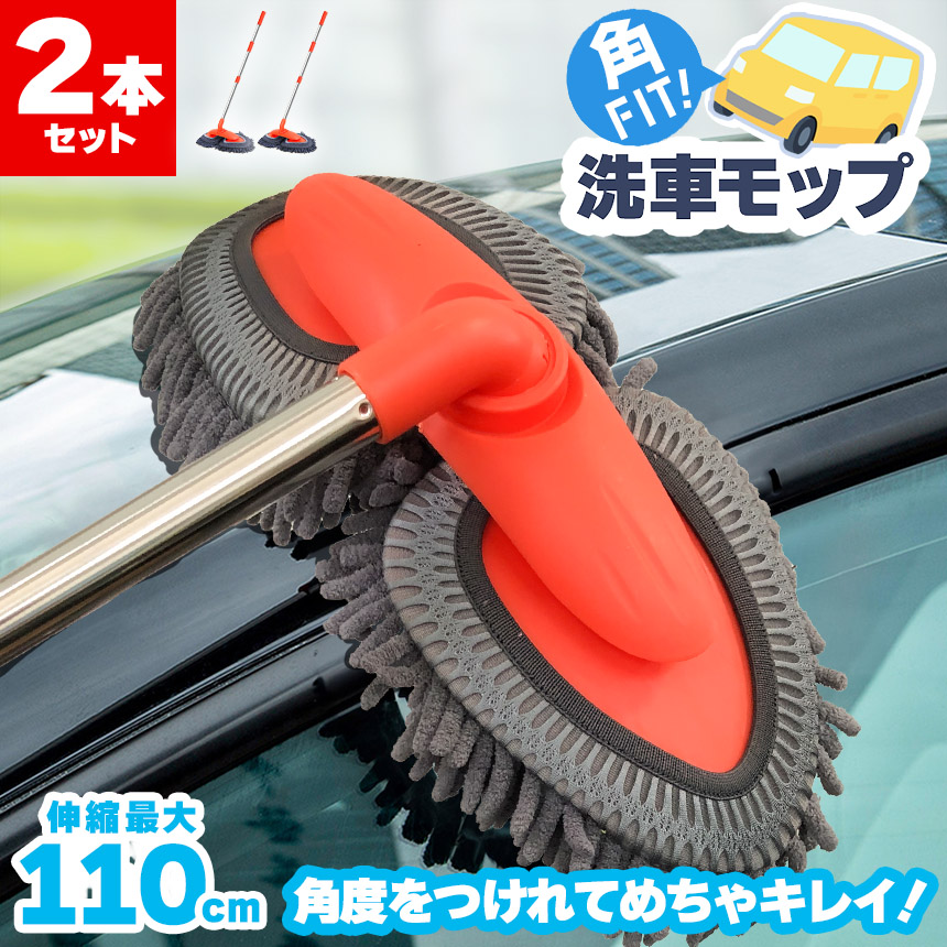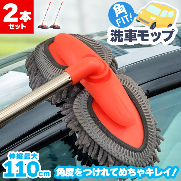 二つのモップがそれぞれ角度が付き、優しくしっかり洗い上げる吸収率抜群モップ、約80〜110cmまで好きな長さに伸縮!これを使えば簡単に愛車を綺麗にできます。モップ部分だけも外せるのでしっかりキレイに清潔にできます。