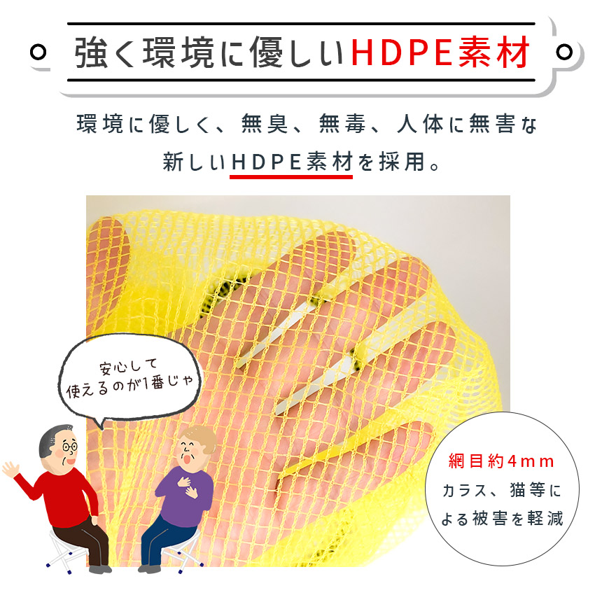 環境に優しく、無臭、無毒、人体に無害な新しいHDPE素材を採用。引っ張り強度にも優れています。網目は4mmと細かく、くちばしからも守ります。
