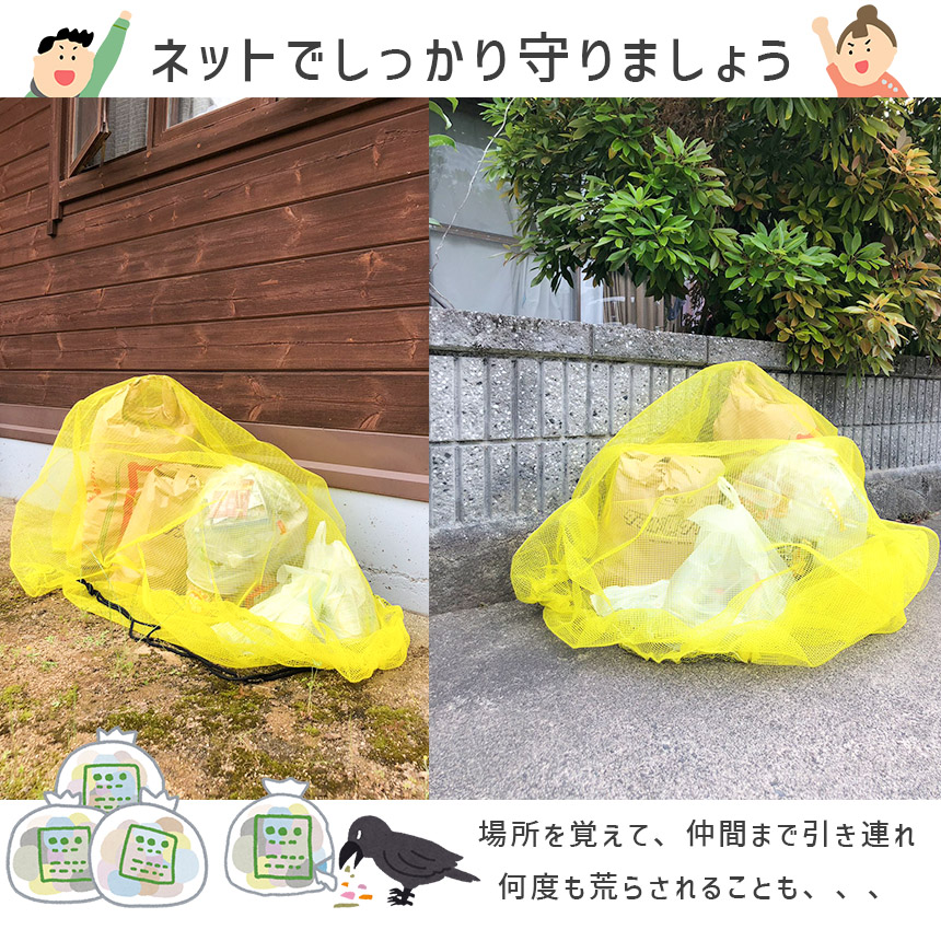 ●重りロープのカラスよけゴミネット●【カラス被害に】カラスのゴミ荒らしの被害は悲惨、、ゴミをこれでもかとあさって散らかしていきます。一回のみならず、記憶して何度もやってきて、ついには仲間も引き連れて荒らし放題、、そんな被害にあわないように、風に強くしっかりくちばしからも守る、この重りロープ付きのネットで対策を!きっと効果に満足していただけます。【重りロープ】ネットをぐるっと囲むように入っているロープは、鉛を含んでいて、重みがあります。風にも強く、荒らしもしにくい丈夫で安心の素材です。【環境に優しい素材】環境に優しく、無臭、無毒、人体に無害な新しいHDPE素材を採用。引っ張り強度にも優れています。網目は4mmと細かく、くちばしからも守ります。