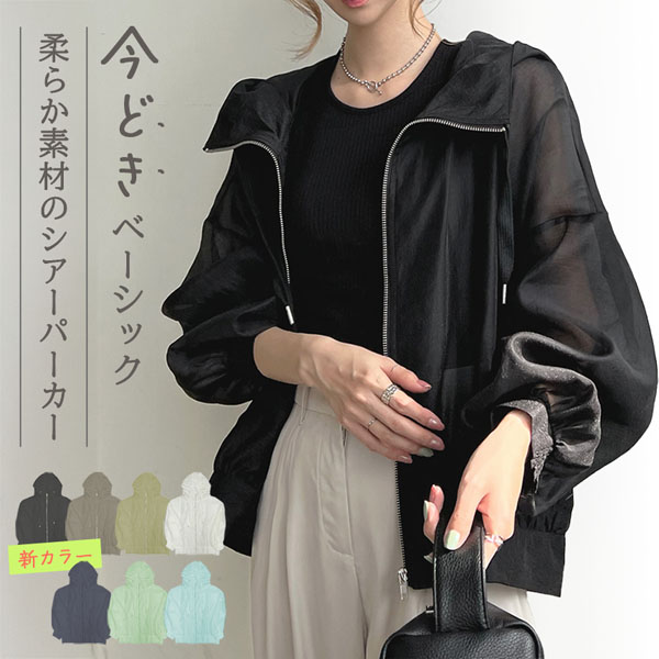 <ふわっと軽いシアーパーカー>今どきシンプルデザインでお出かけやオフィスにもおすすめのアイテム◎■デザイン透け感が涼やかなシアードルマンパーカー。ゆるっとやや広めのデザインに袖口や裾幅のくしゅっとしたデティールが華奢見え効果に◎フード先とファスナーのシルバーが大人っぽく落ち着いた印象でカジュアルにもフォーマルにも合わせやすいデザインです。ゆったり軽いシルエットが気になる部分もしっかりとカバーしてくれます。