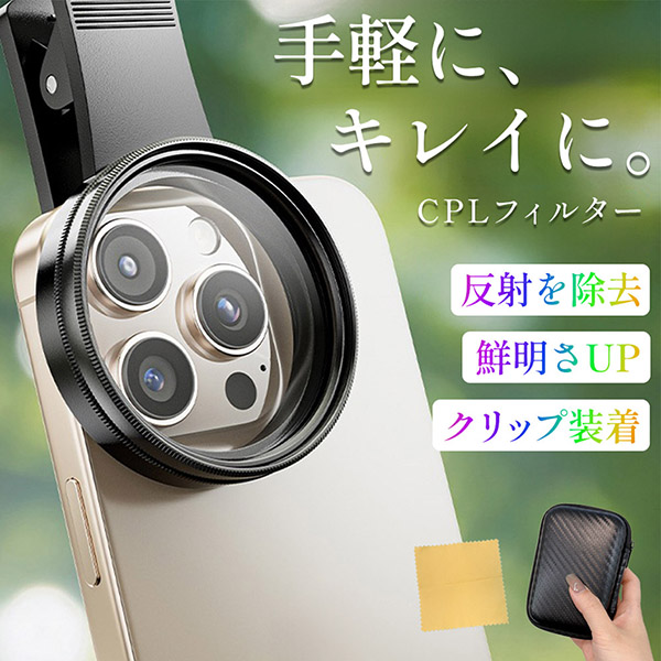 CPLフィルター 偏光レンズ スマホ クリップ 52mm C-PL PL フィルター レンズ 写真 撮影 カメラ 反射光抑制 CPL偏光フィルター ガラス 円偏光 iPhone iPad Android 携帯 ケー