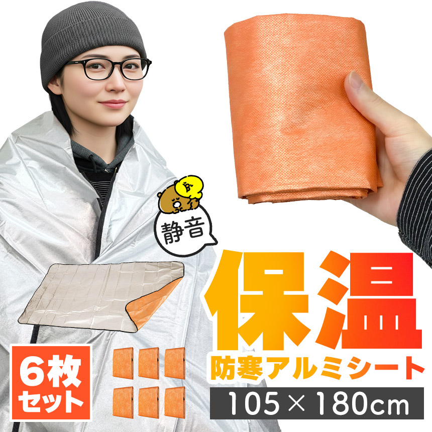6枚セットアルミブランケット アルミシート 防災 保温 シート 180×105cm 簡易毛布 不織布付き 静音仕様 かさかさ サバイバルシート アルミ毛布 緊急用 防災グッズ アウトドア 車中泊 キャンプ 避難用 保温毛布 保温 静音 アルミシート 補助寝具 避難所 登山 断熱 防寒