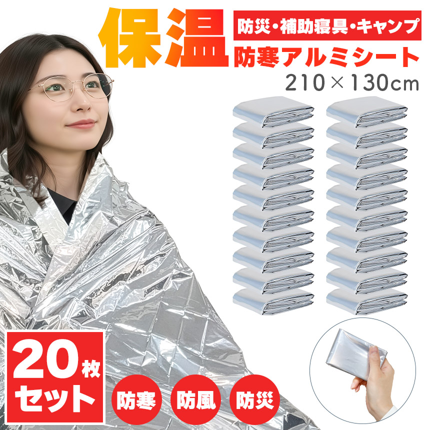 20枚セットアルミブランケット アルミシート 防災 保温 シート 210×130cm 簡易毛布 静音仕様 かさかさ サバイバルシート アルミ毛布 緊急用 防災グッズ アウトドア 車中泊 キャンプ 避難用 保温毛布 保温 静音 アルミシート 補助寝具 避難所 登山 断熱 防寒