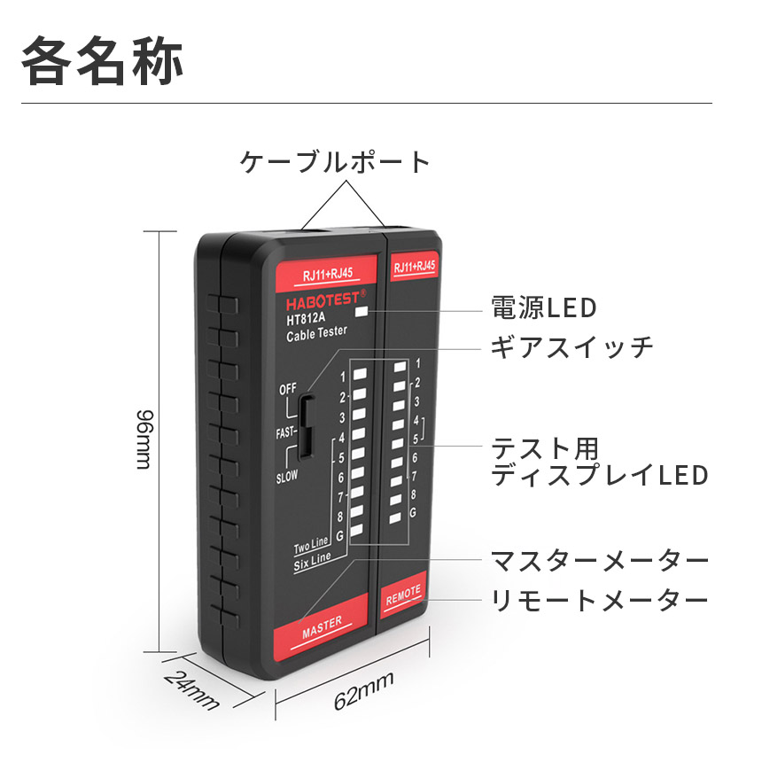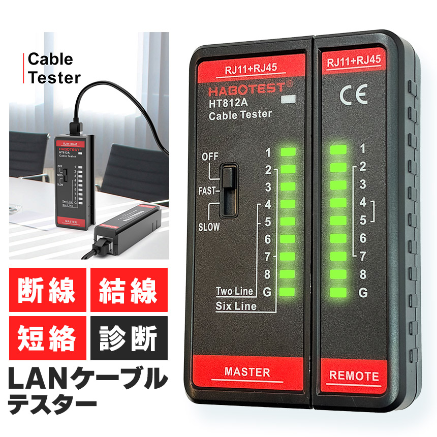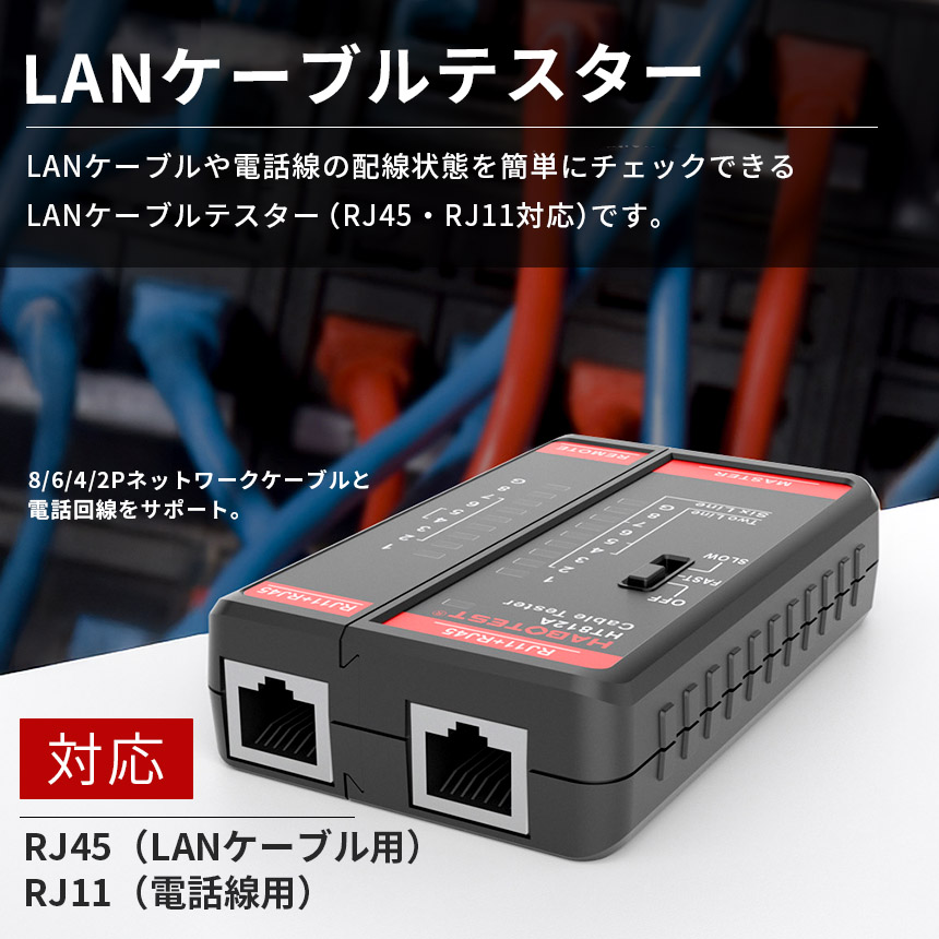 LANケーブルテスター RJ45 RJ11 対応 配線チェッカー 導通テスター ネットワークケーブルテスター 電話線 対応 自動テスト モード切替 FAST SLOW LAN工具 ネット修理 電気工事 DIY ケーブル テスター テスター メーター 電話線テスター 分割設計