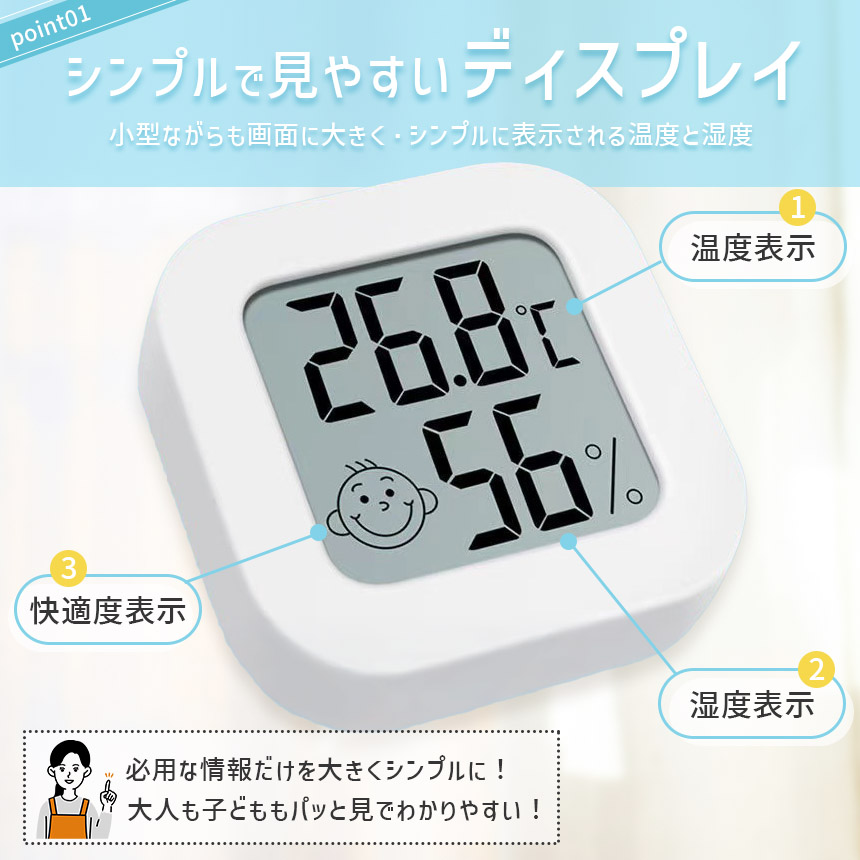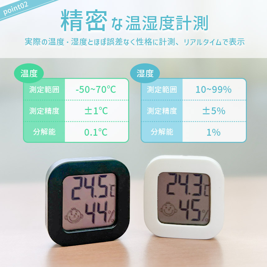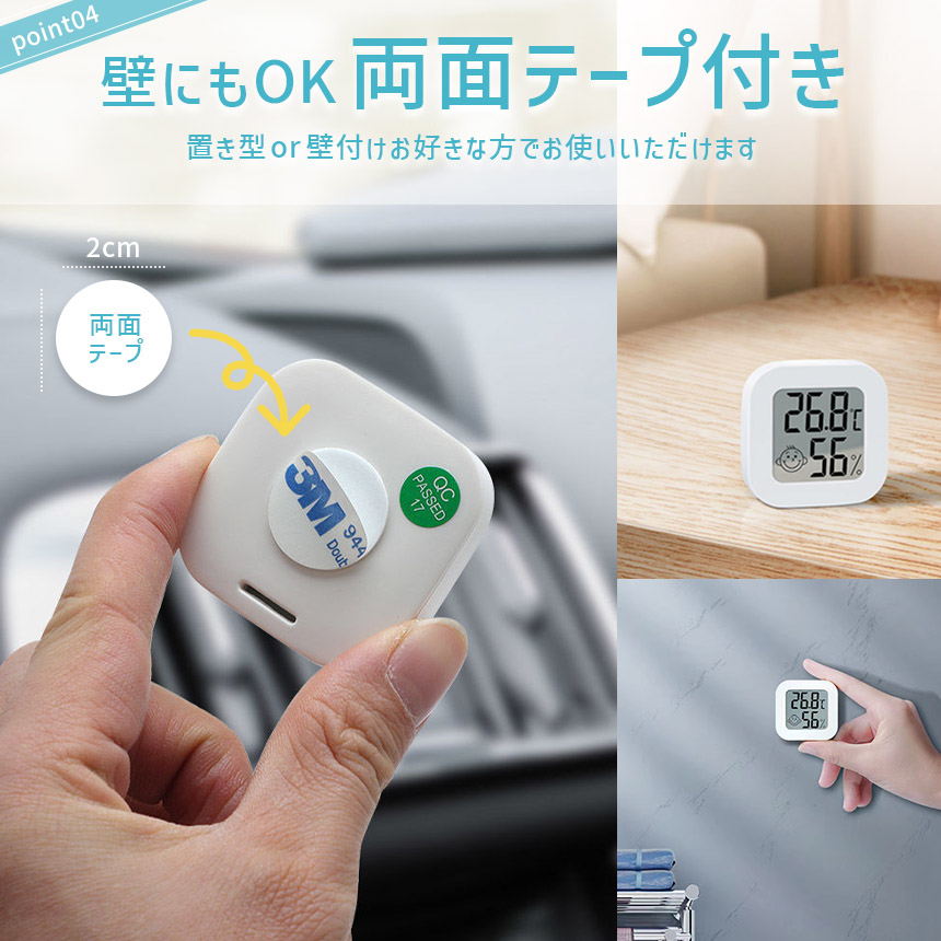 温湿度計 小型 高精度 デジタル ミニ コンパクト 温度計 湿度計 室温計 置き型 スタンド 壁掛け 両面テープ付き 電池式 小さい シンプル かわいい おしゃれ 顔マーク 薄型 赤ちゃん 子供 子ども 熱中症対策 乾燥対策 ブラック ホワイト 黒 白 卓上