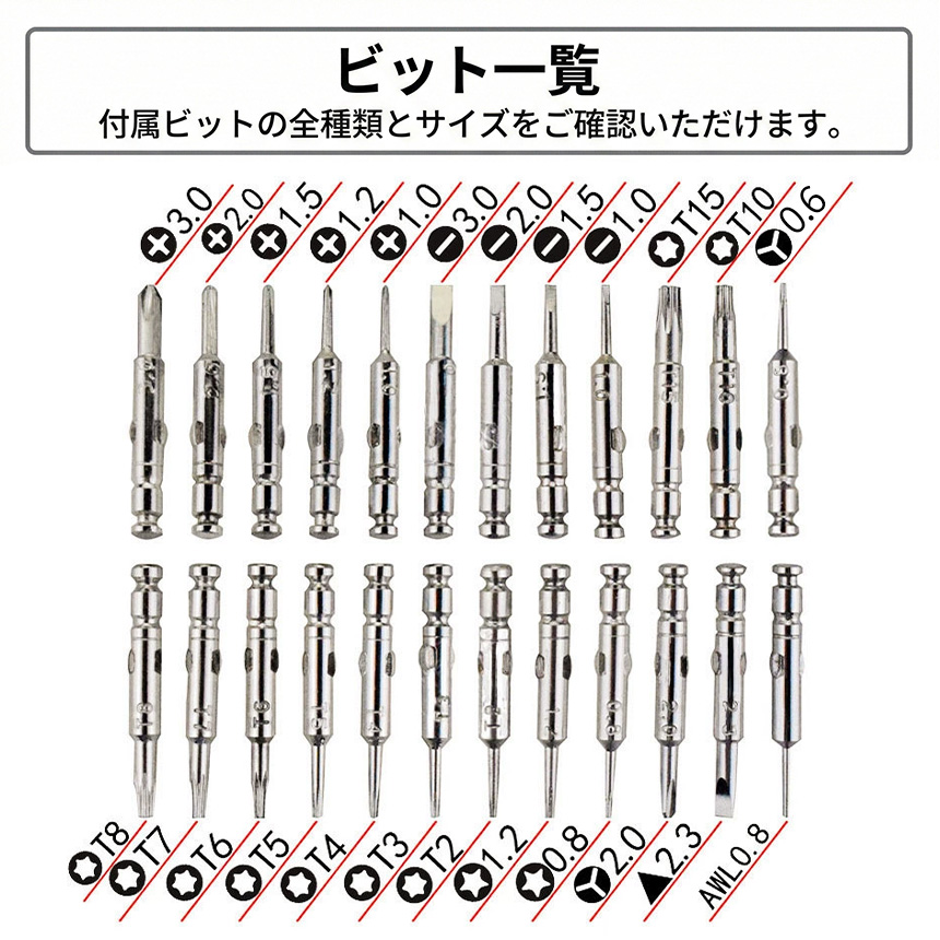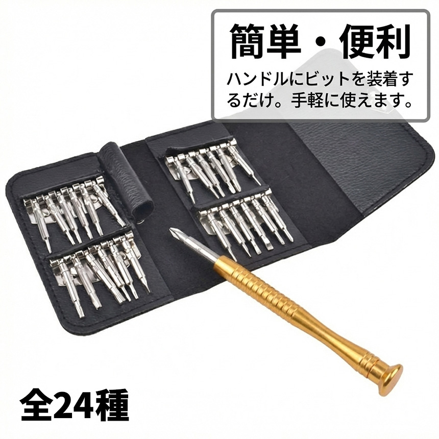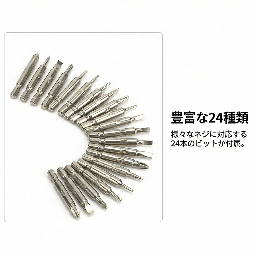 プラス・マイナスはもちろん、トルクス(星型)、Y型、三角ネジなど、24種類のビットを網羅。市販の製品に使われている特殊ネジにもしっかり対応します。