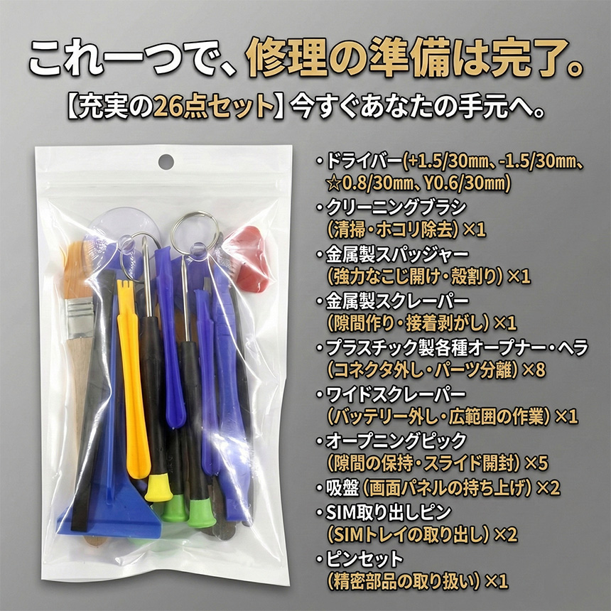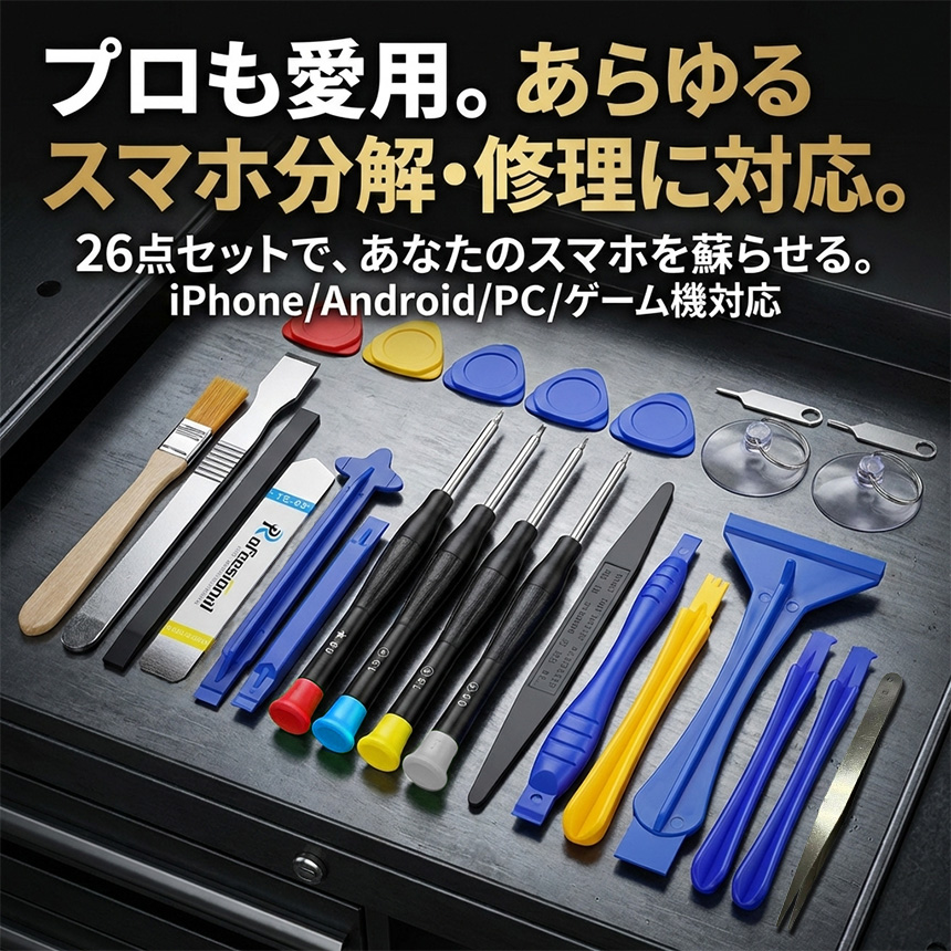 スマホ修理工具 26点セット iPhone Android Switch等多機種対応 バッテリー交換 画面修理 分解キット 精密ドライバー Y型 星型 特殊ネジ ヘラ 吸盤完備 分解 修理