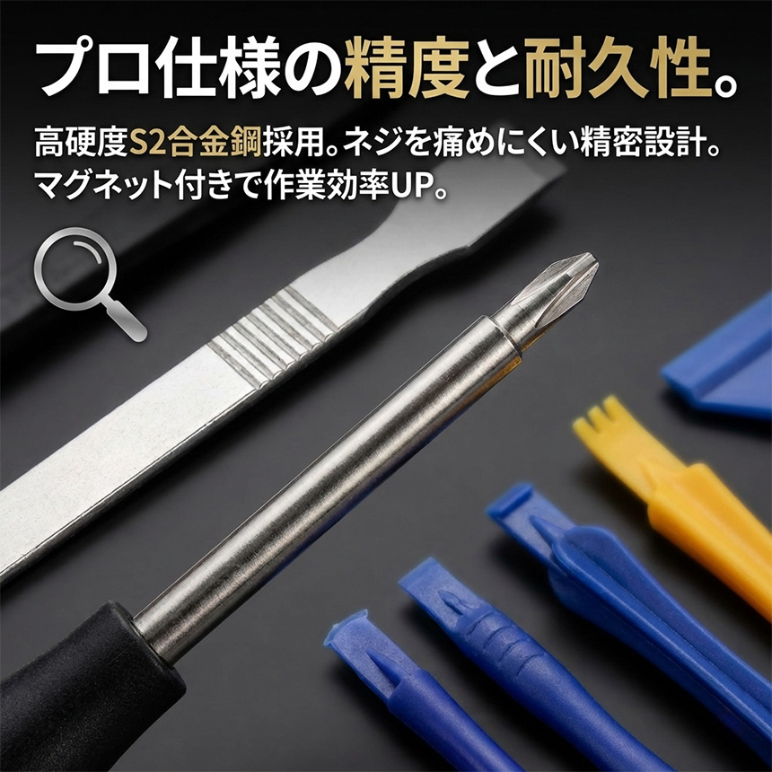 固く接着されたパネルを安全にこじ開ける金属製スパッジャーや、デリケートな内部パーツを傷つけずに分離できる各種プラスチック製ヘラ、強力な吸盤など、かゆいところに手が届くツールが全て揃っています。