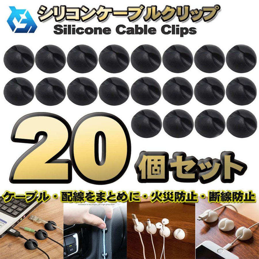 【20個セット】シリコンケーブルクリップ(小) ケーブル配線の整理・火災防止・断線防止 強力両面シールでしっかり固定 【ブラック】