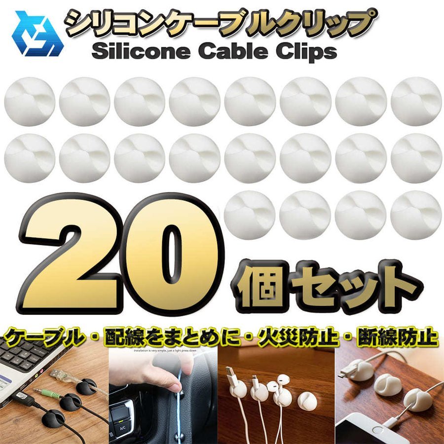 【20個セット】シリコンケーブルクリップ(小) ケーブル配線の整理・火災防止・断線防止 強力両面シールでしっかり固定 【ホワイト】