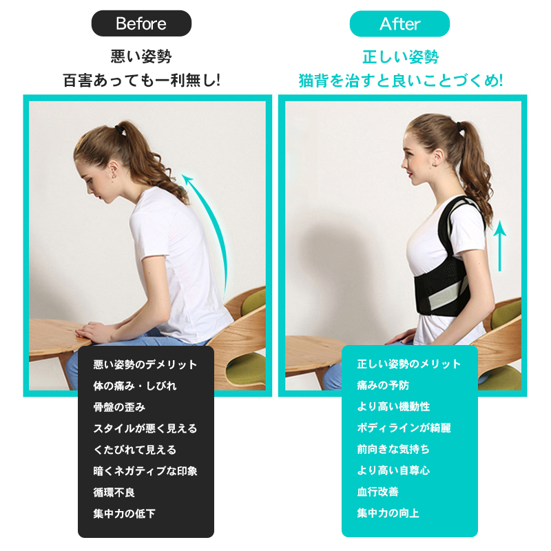 矯正するだけであれば、重量があり、金属プレートの入ったものが理想です。しかし、姿勢矯正は、短時間で正しい姿勢に治るものでなく、数ヶ月と長期に渡って身につけて頂く必要があります。