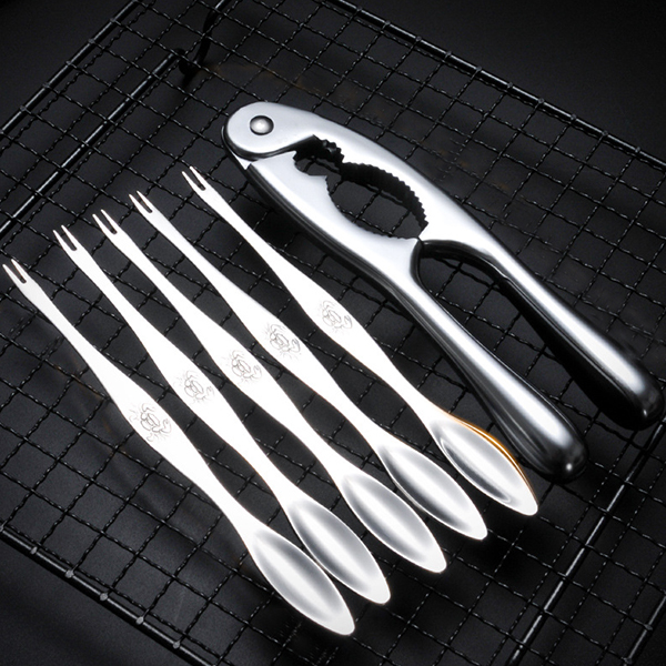 カニの殻を割るためのクラッカーと、身を取り出すためのスプーンとフォークのセットです。