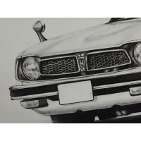昔懐かしい日本の名車を鉛筆のみで描いています。地面ギリギリの車体にワイドタイヤでツライチにすることでパワーを感じる作品にしています。
