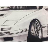 昔懐かしい日本の名車を鉛筆のみで描いています。地面ギリギリの車体にワイドタイヤでツライチにすることでパワーを感じる作品にしています。