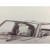 白い紙に白いバックで白い車を描く技術は素晴らしく、ボディのふくらみやプレスラインも鉛筆の濃淡だけで表現されているのを見ているととても不思議に感じます。