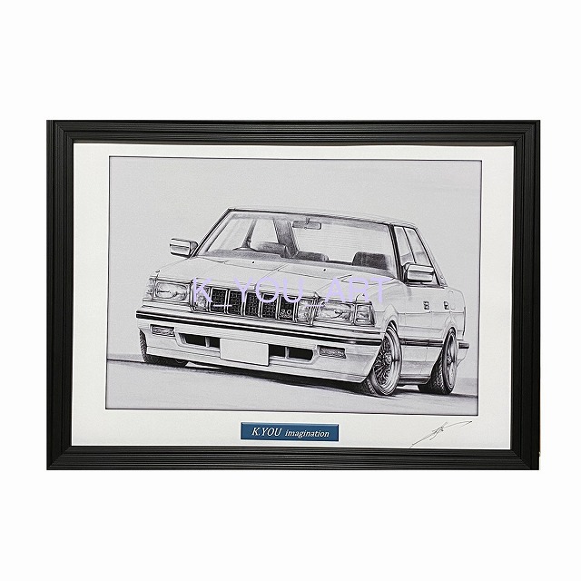 昔懐かしい日本の名車を鉛筆のみで描いています。地面ギリギリの車体にワイドタイヤでツライチにすることでパワーを感じる作品にしています。