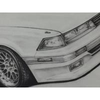 昔懐かしい日本の名車を鉛筆のみで描いています。地面ギリギリの車体にワイドタイヤでツライチにすることでパワーを感じる作品にしています。
