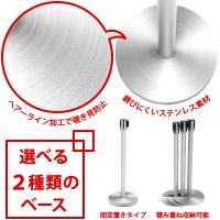 フラット型とU型の2種類のベースをご用意しております。日常的に設置したい場合はフラット型のベースが、常に収納することが考えられる場合は積み重ね収納可能なU型のベースがおすすめです。錆びにくいステンレス素材を使用し、さらに、ヘアーライン加工によって映り込みを防いでいるので、人が多く集まる場所でも安心してお使い頂けます。