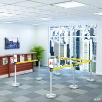 有名なお店やお昼時などでお客様が集中する場合、お並び頂いた順番を重視する必要があります。このような場面でお客様に整列していただくために用意されているものがベルトパーテーションです。使わないときはベルトを収めて、使用時にベルトを引出し簡易な仕切りを作ることができます。ベルトパーテーションは低すぎても高すぎても意味を成しませんので、標準的な高さの89cmになるように設計しました。
