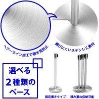 フラット型とU型の2種類のベースをご用意しております。日常的に設置したい場合はフラット型のベースが、常に収納することが考えられる場合は積み重ね収納可能なU型のベースがおすすめです。錆びにくいステンレス素材を使用し、さらに、ヘアーライン加工によって映り込みを防いでいるので、人が多く集まる場所でも安心してお使い頂けます。